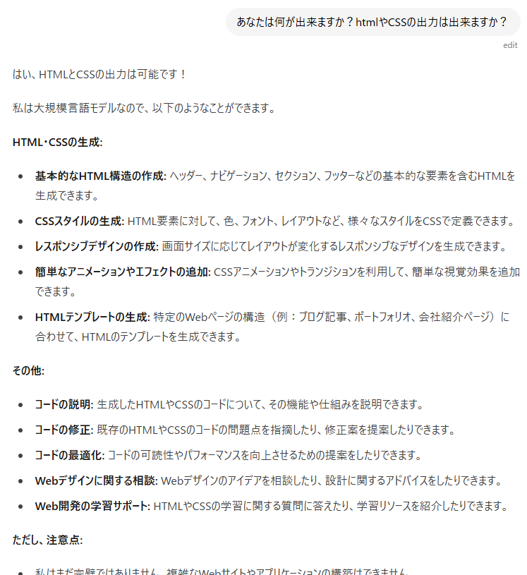 試しにhtmlやCSSが書けますか?と聞くと以下の回答がありました!