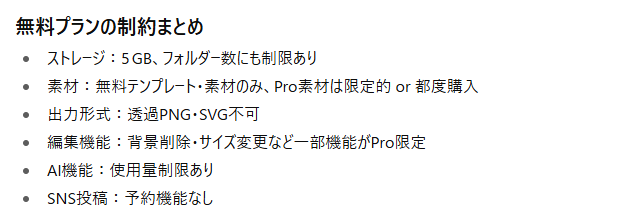 ということで、しばらくは課金なしでやってみたいと思うのですが、前提として何が出来ないのか、ChatGPTに聞いてみました。