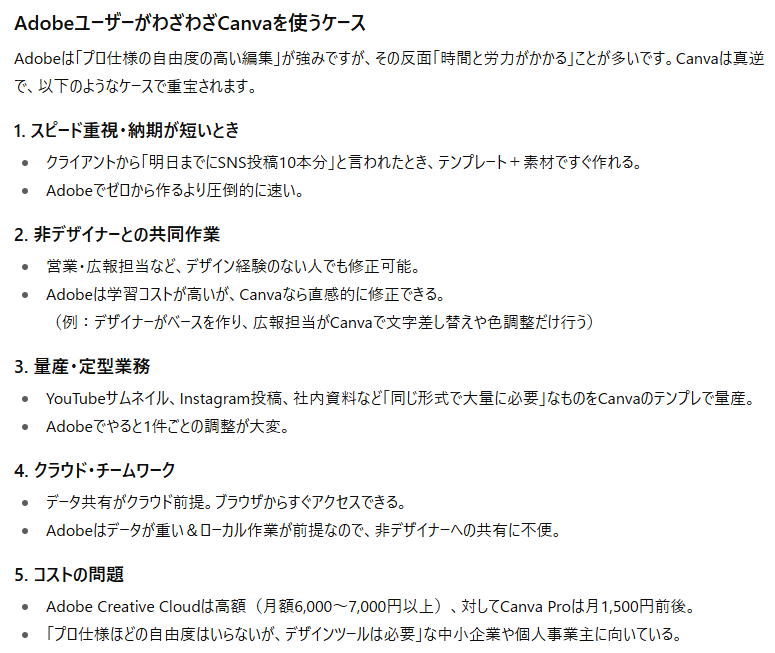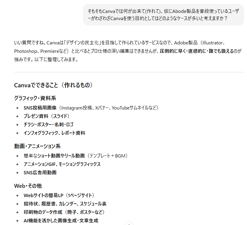 改めて、Adobe製品を普段使っている状況でCanvaを使うケースとしてどのようなものが考えられるか、ChatGPTに聞いてみました。