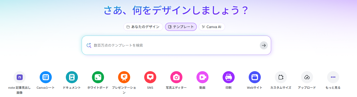 Canvaの管理画面トップでは以下のようなクリエイティブ制作のアイコンが並んでいます。