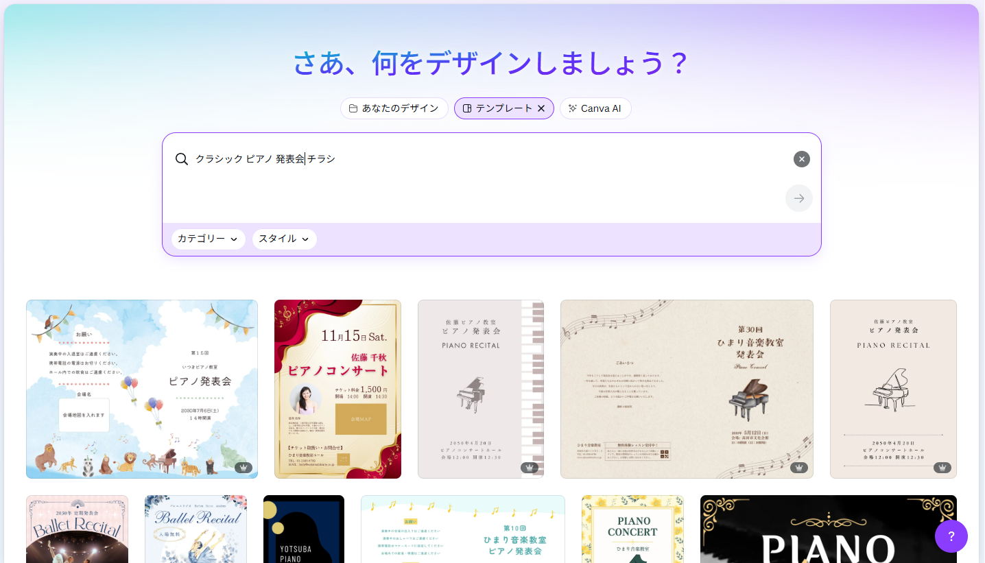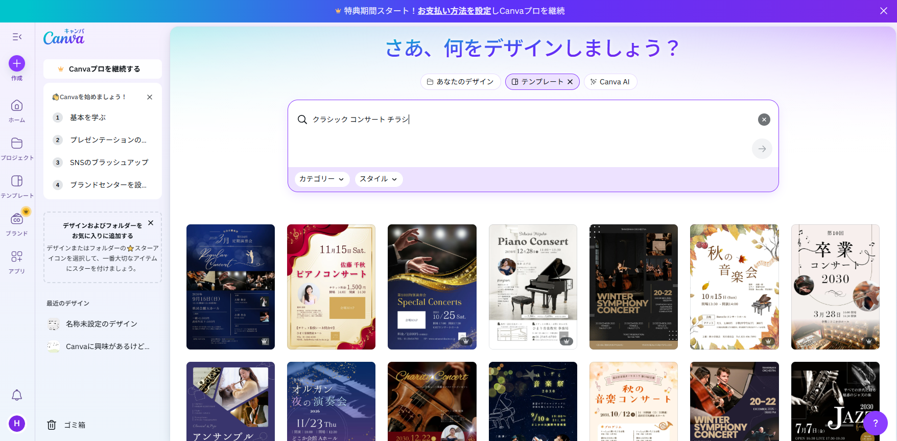 Canvaのトップページで【クラシック コンサート チラシ】など検索するだけで、Proプランでなくても実用的なテンプレートがかなり見つかります。私の事業では、とりわけクラシック音楽関連のクライアント様を想定しているので、こんな感じでパッとデザインイメージ(というか場合によってはそのまま内容変えるだけ?)でデザインを提供できるのはかなり実用的だと思いました!